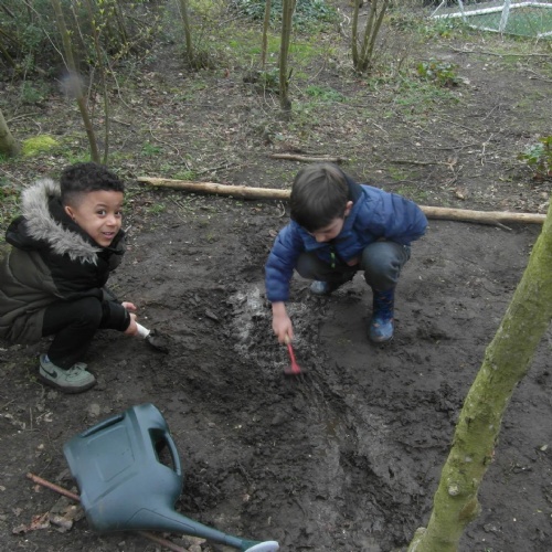 Forest school sessions takes place in the wooded area on the playground. We also use the pond and allotment area. These areas provide open spaces where the children can explore and connect with a natural environment.