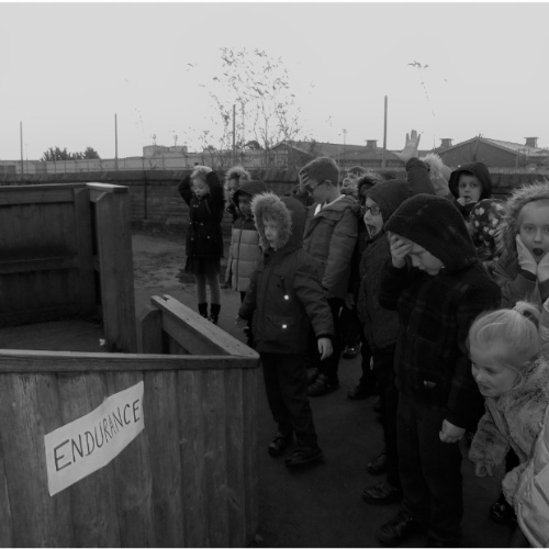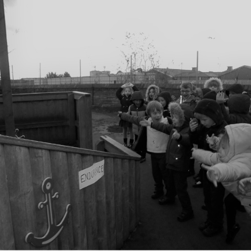 In Key Stage 1, as part of our Explorers topic, we learn all about the adventures of Sir Ernest Shackleton! Here you can see us aboard 'The Endeavour' trying to get to the South Pole!